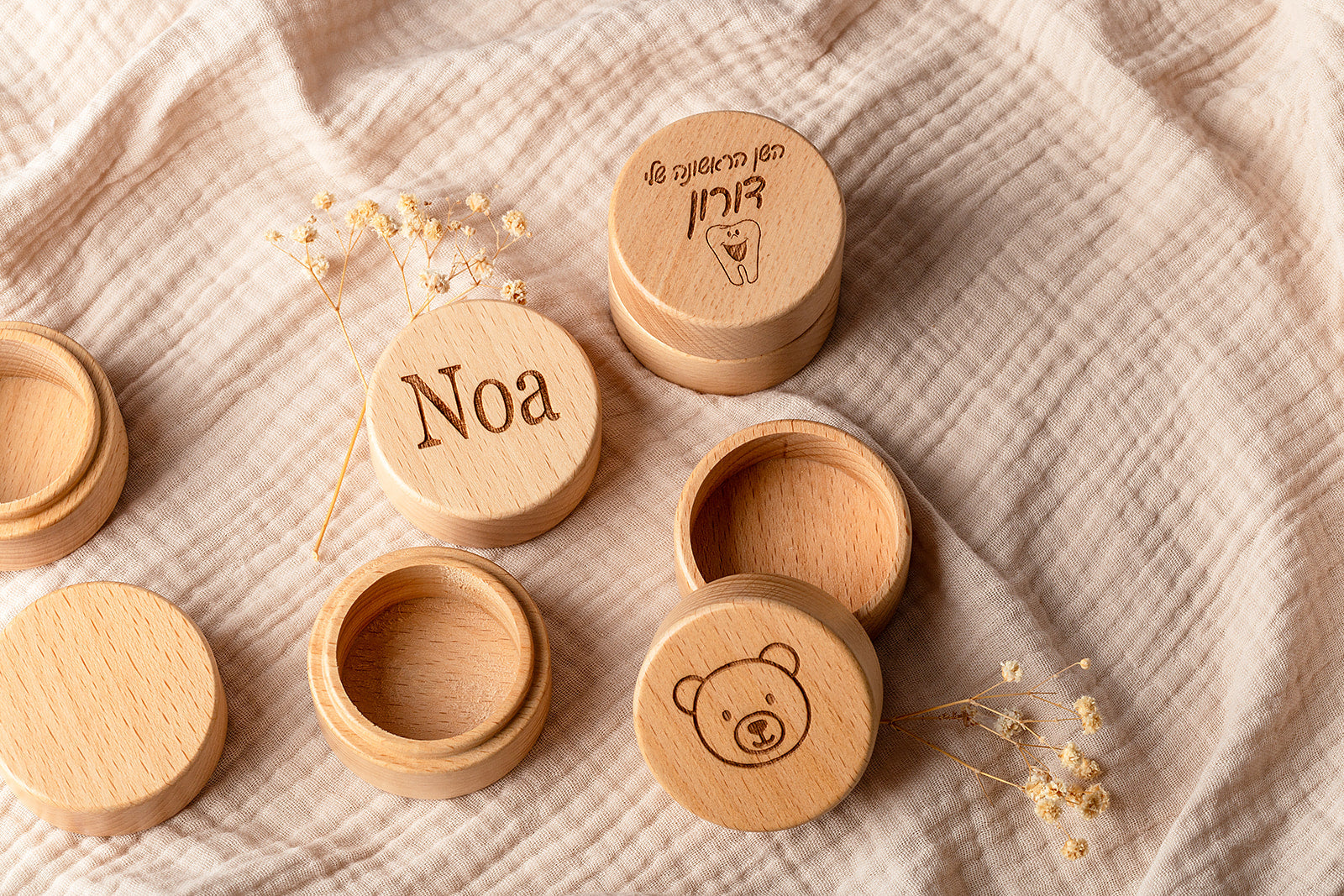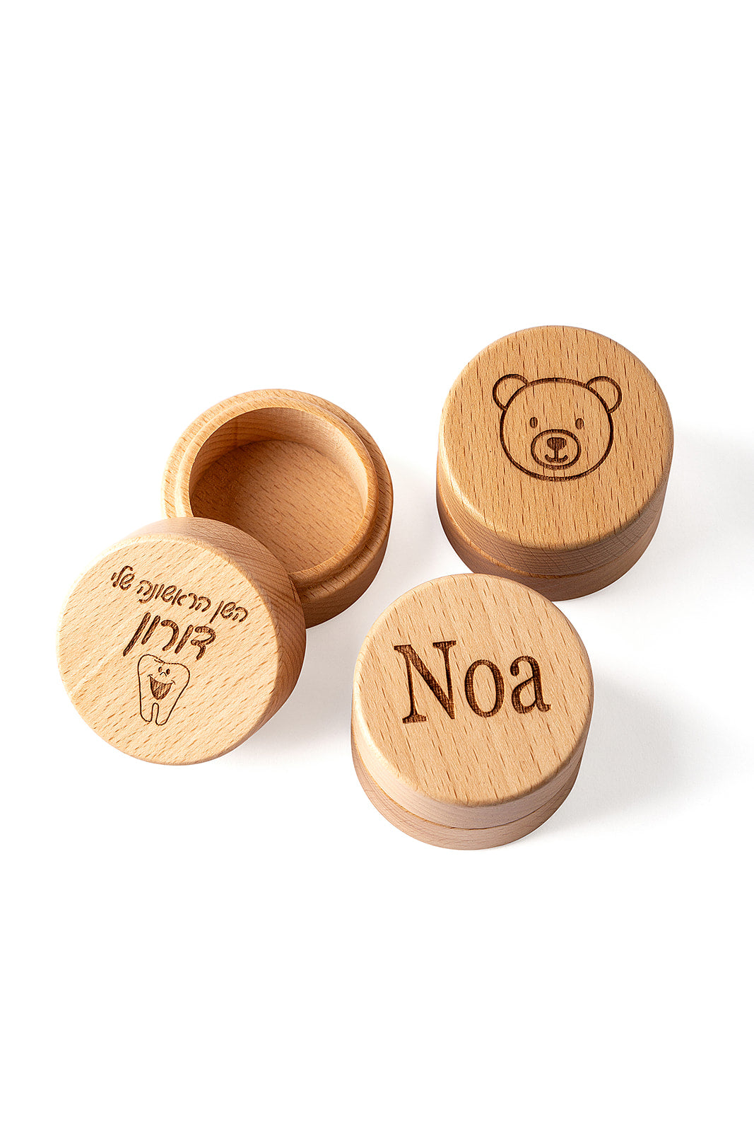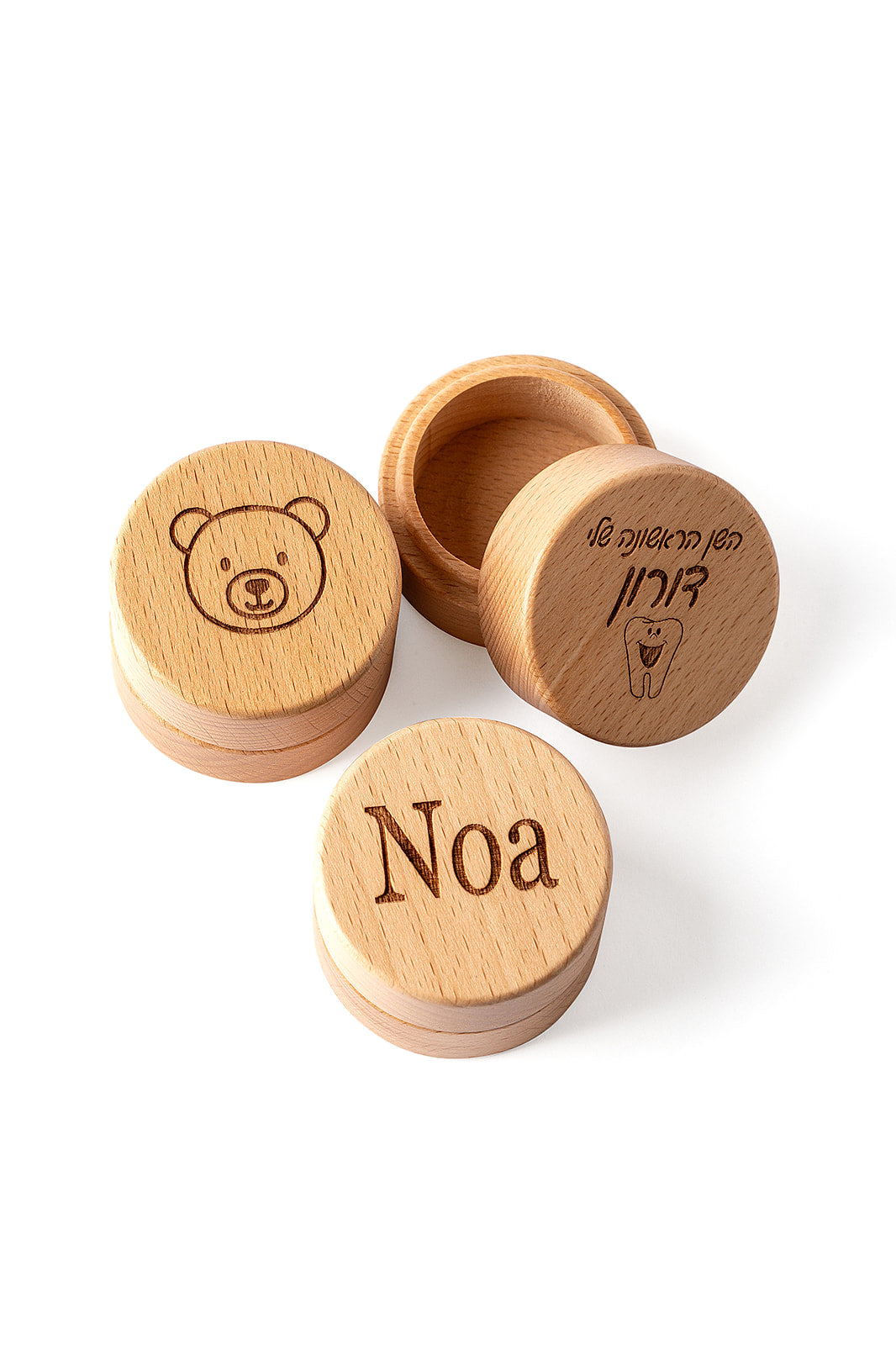 קופסת עץ עגולה בעבודת יד, בקוטר 5 ס"מ וגובה 4 ס"מ - בדיוק בגודל הנכון לשמור את המזכרות הכי אישיות ומשמעותיות. השן הראשונה שנפלה, קווצת שיער מהלידה או כל פריט קטן עם ערך רגשי. הקופסה הזו תהפוך אותם לייחודיים ותלווה אתכם לאורך השנים. על המכסה ניתן להוסיף חריטה אישית: שם, תאריך או איור מתוק - מה שהופך אותה למתנה אישית ומרגשת להורים טריים, לילדים ולכל מי שאוהב לשמור רגעים קרובים ללב.