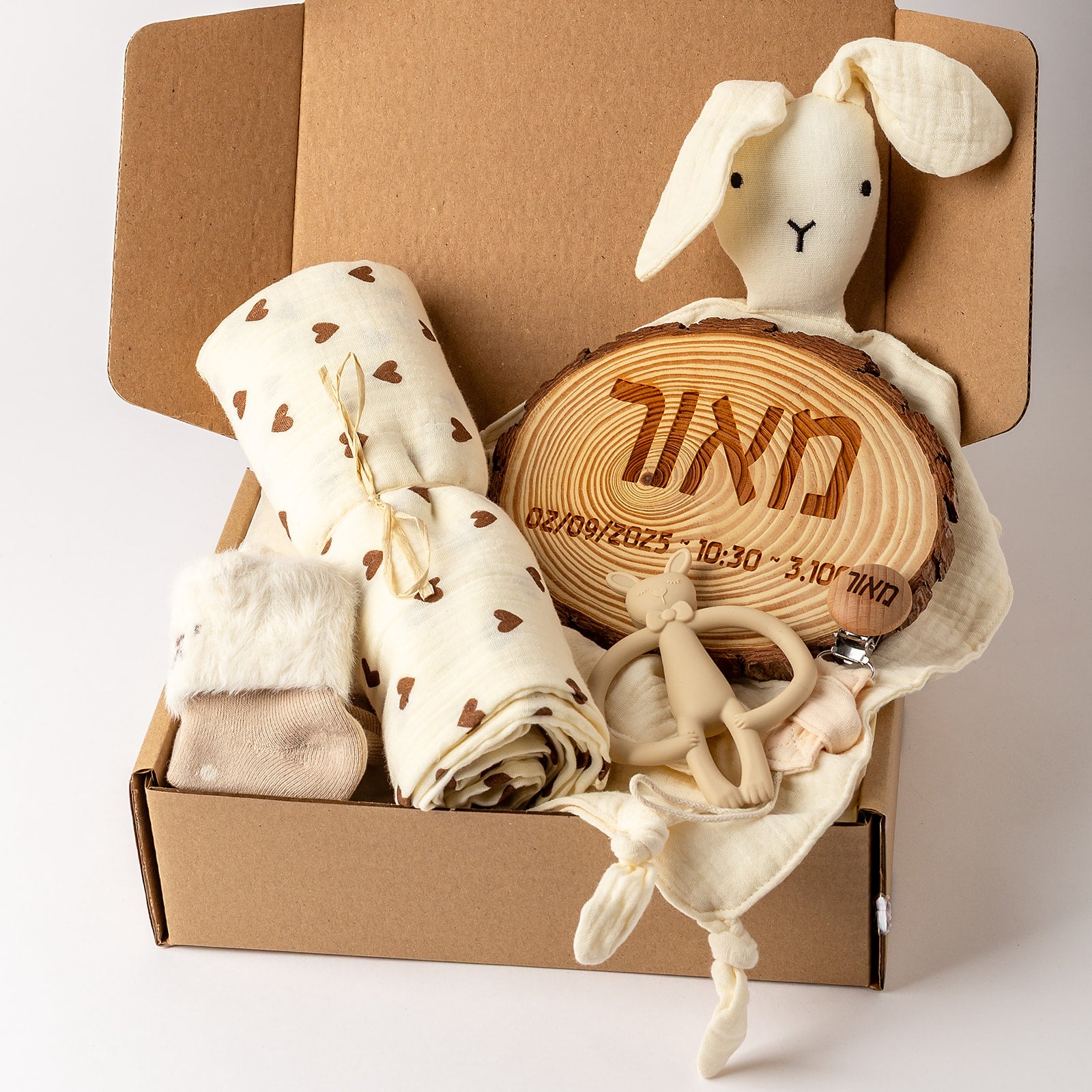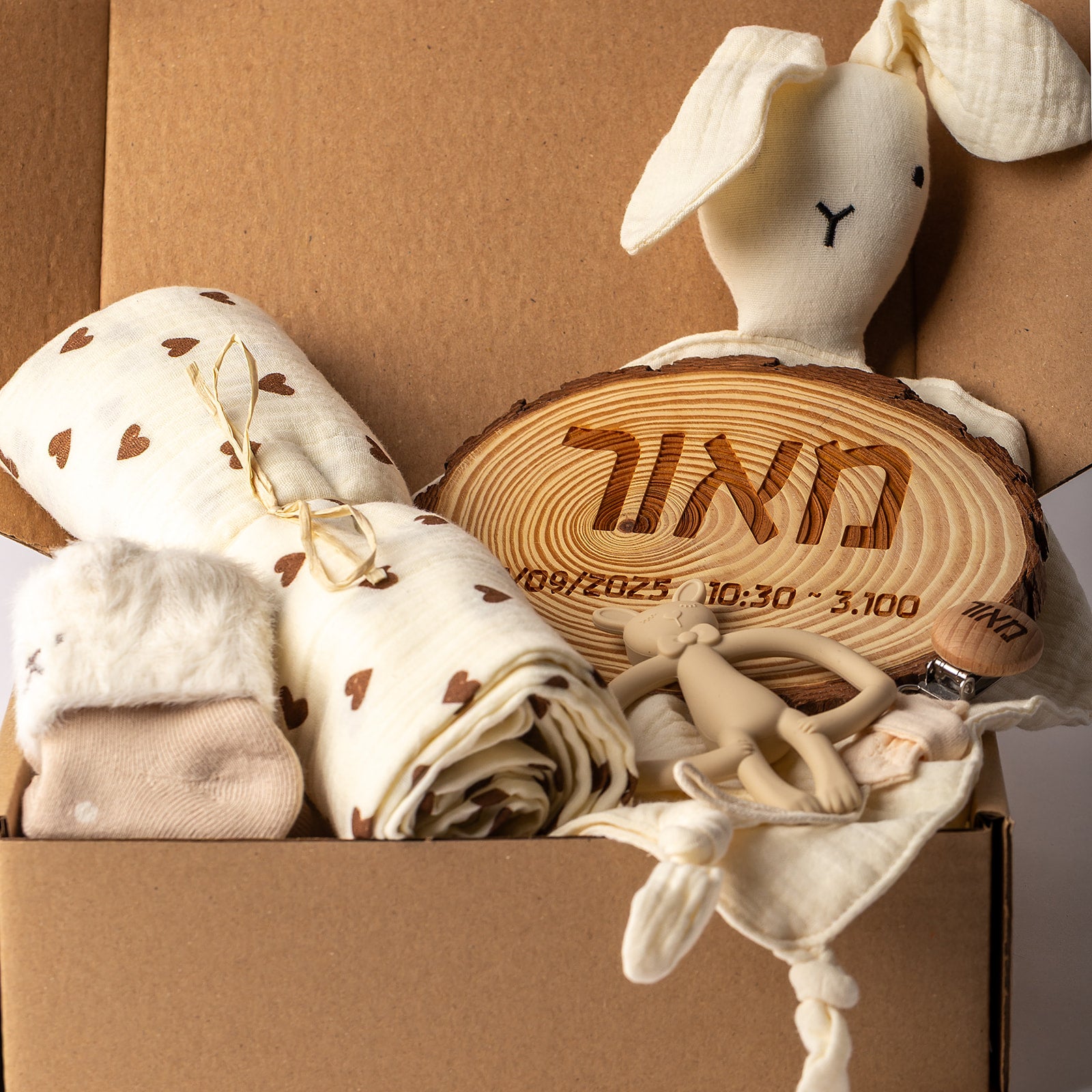 מארז לידה עם חריטה אישית, טקסטיל רך ופריטי התפתחות מוקפדים