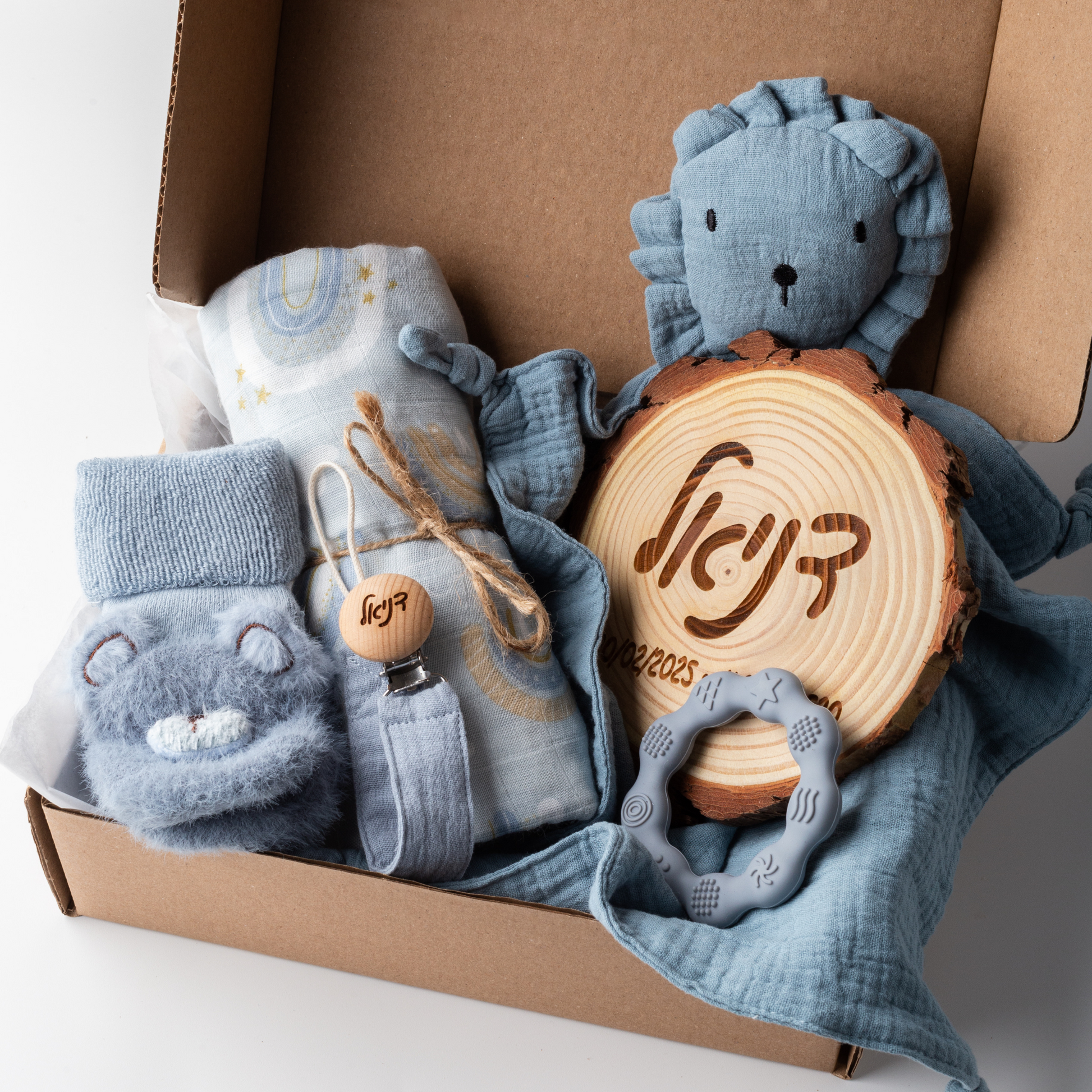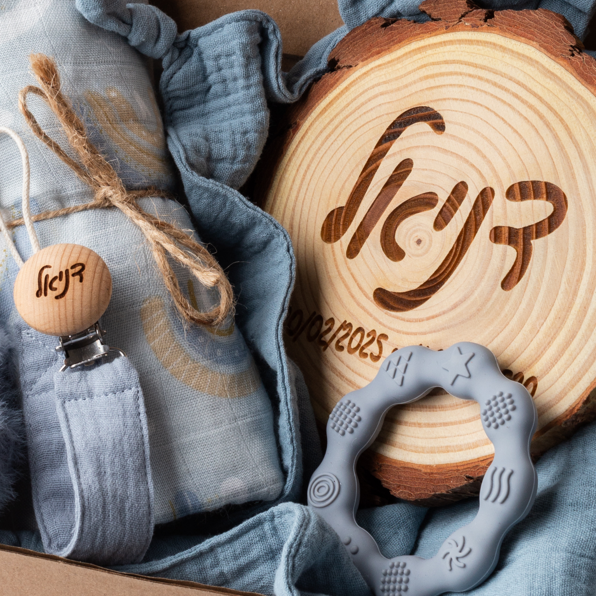 מארז לידה עם חריטה אישית, טקסטיל רך ופריטי התפתחות מוקפדים