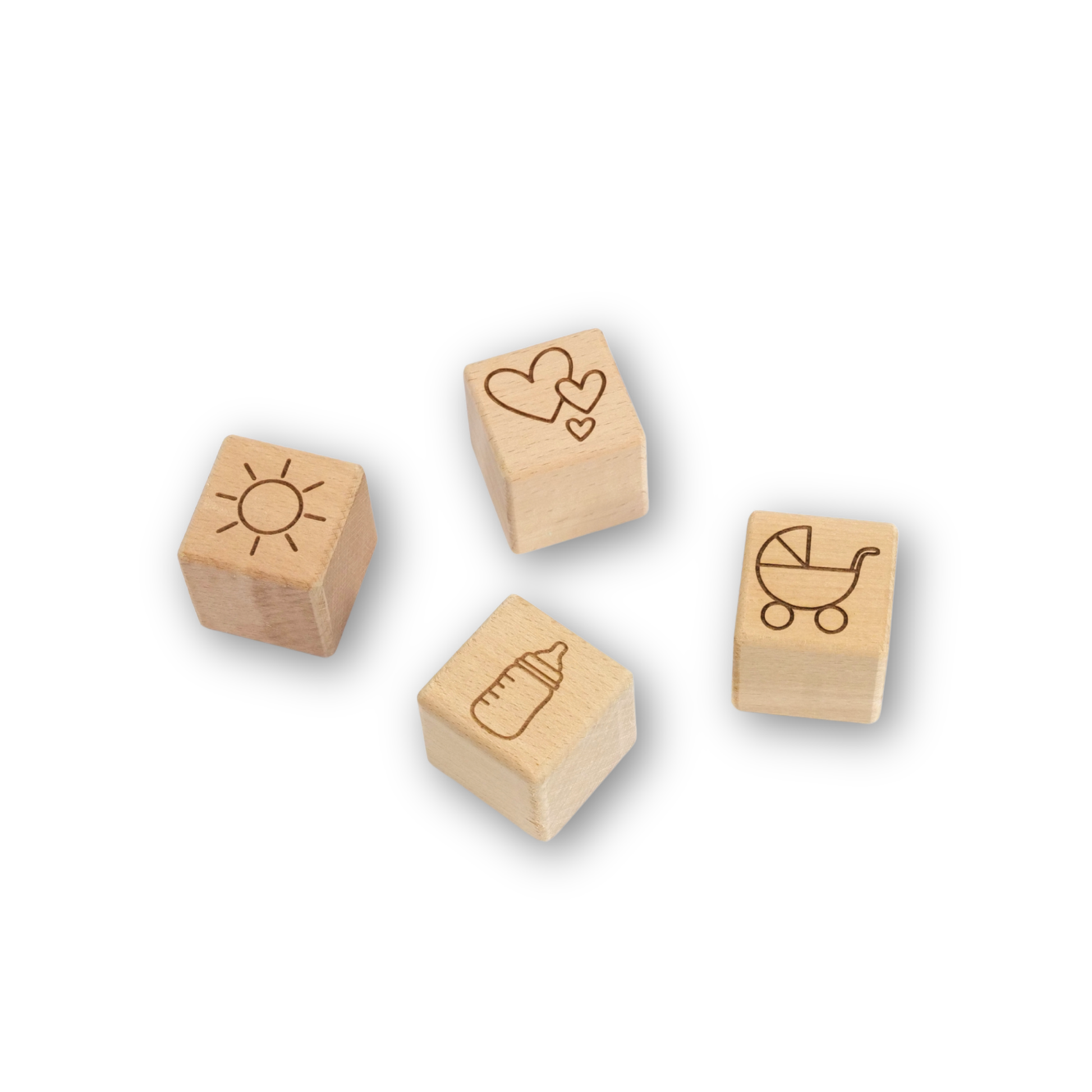 4 קוביות איורים בעבודת יד (4 ס"מ כל אחת) - שמש, לבבות, עגלה, בקבוק.